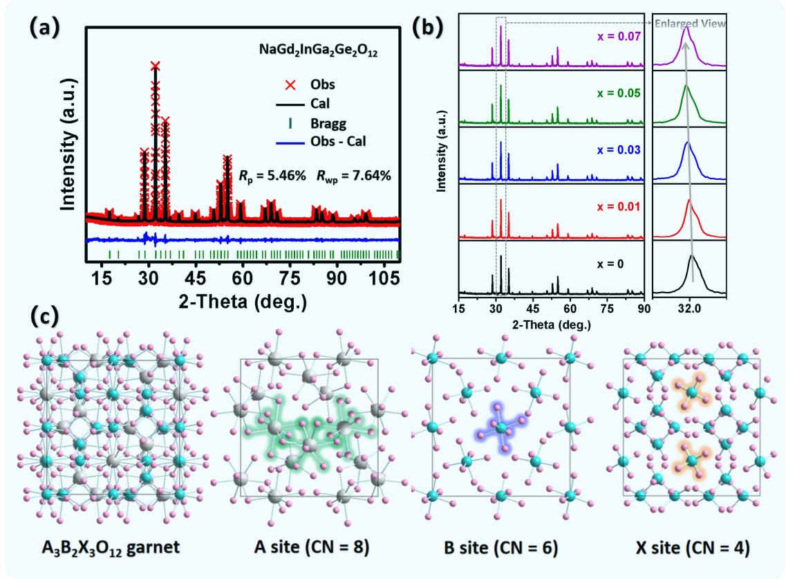 图1. 石榴石同构新化合物NaGd2InGa2Ge2O12的X结构表征与晶胞示意