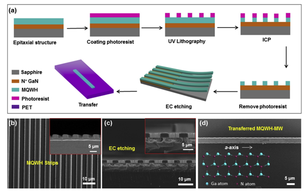 近日,省科学院半导体产业技术研究院科研人员采用电化学腐蚀方法实现了蓝宝石衬底的剥离,并将剥离后的微米线结构转移到PET柔性衬底上,通过对微米线器件施加外部应变,可调节量子阱异质结的能带,从而调控载流子传输,实现压电式应变传感,与已有的应变传感器相比,该结构具有成本低、易于制作、在低偏置和应变小的情况下具有较高的灵敏度等明显优点。