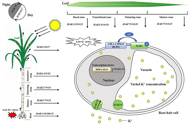 省科学院生物工程所生物育种研究团队近年来一直在探索甘蔗钾高效的遗传基础和分子机制,以期为甘蔗耐低钾品种的选育提供理论指导。该团队利用比较基因组学等生物信息学方法在甘蔗属割手密中鉴定到30个钾转运蛋白HAK基因,结合14个代表性的被子植物共279个HAK成员进行了系统演化分析,并且分析了甘蔗HAK家族基因在不同发育时期、昼夜节律、不同叶段以及在低钾胁迫下的表达,提出HAK基因家族不同成员的作用部位及功能,研究结果以题为“Genome-wide systematic characterization of the HAK/KUP/KT gene family and its expression profile during plant growth and in response to low-K+ stress in Saccharum”发表在BMC Plant Biology (IF=3.67)。该研究鉴定到了能提高甘蔗钾肥利用效率的可靠候选基因,为进一步通过现代精准育种技术培育钾营养高效利用的甘蔗优良品种奠定了基础。冯晓敏博士为第一作者,齐永文研究员为本文通讯作者。该工作得到了广东省科学院博士引进专项资金、国家糖料产业技术体系和广东省科技计划等项目资助。