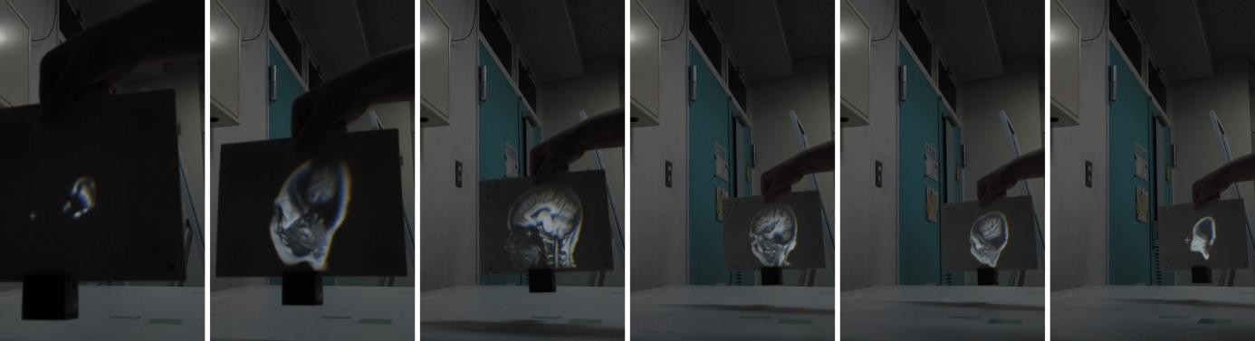 通过本方法,研究团队列举了一些可能的应用场景。如,医学扫描图像显示中的切片显示(Volume Slicing Display),可使用本技术在三维虚拟空间内显示三维CT/MRI等信息,进而改善使用传统二维显示器观察三维数据所造成的违和感,提升医生、患者和显示系统之间的人机交互能力。此外,系统可以将任意物理表面当作可交互的显示设备,并通过投影动态信息改变物体的视觉表现力。