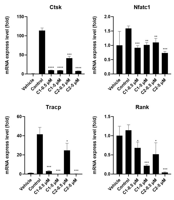 图3. 活性好的2个天然产物显著抑制破骨细胞成熟分化中关键基因的表达。