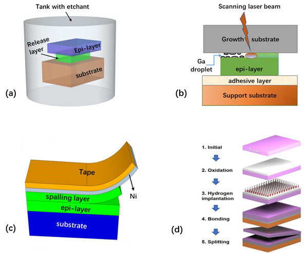 图1:半导体薄膜和芯片转移技术分类示意图:(a)外延剥离技术,(b)激光剥离技术,(c)机械剥离spalling,(d)离子切割。