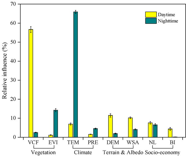 研究还发现,无论年尺度还是季节尺度,森林覆盖率和背景气温分别对日间和夜间热岛强度起主导作用(图2)。除此之外,不同季节的热岛强度还主要受其他因子影响:对于日间热岛,其他主要因子包括夏季的人为热排放和降水、过渡季的人为热排放和地形、冬季的气温和地表反照率;对于夜间热岛,所有季节的人为热排放、夏季和过渡季的植被活力、冬季的降水也具有重要贡献。