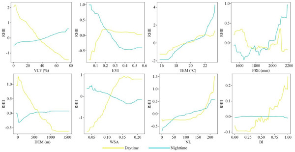 此外,偏依赖关系图显示了在保持其他驱动因子不变的情况下,某驱动因子与热岛强度的边际效应,能够探测热岛强度对每个驱动因子变化的非线性响应。热岛强度与各驱动因子的边际效应在日间和夜间的显著差异阐明了不同的驱动机制(图3)。
