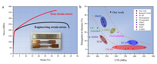 结构材料领域追求的目标之一是获得既强又韧、综合性能优异的金属材料,但材料强塑性的同步提升,是极具挑战性的课题。本研究通过冷喷涂固态增材制造技术,在材料内部实现了完整的异质微纳梯度结构,获得了具有双峰晶粒特征的纯铜块材,具有优异的强度和延展性(抗拉强度271 MPa,断裂伸长率43.5%,均匀伸长率30%),同时解决了传统冷喷涂脆性的局限问题,进一步提升了纯铜这一传统材料的强韧性。