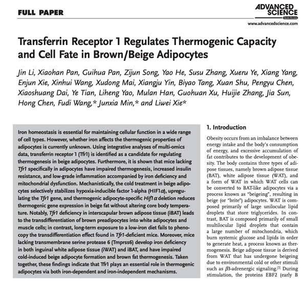 近日,省科学院广东微生物研究所谢黎炜研究员联合浙江大学公共卫生学院王福俤教授、浙江大学转化医学研究院闵军霞教授在国际著名期刊 Advanced Science(影响因子:15.804)在线发表研究成果“Transferrin Receptor 1 Regulates Thermogenic Capacity and Cell Fate in Brown/Beige Adipocytes”。