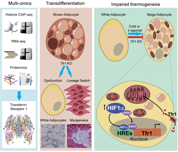 该研究利用多组学技术,首次阐明转铁蛋白受体1(Tfr1)和铁稳态调控棕色/米色脂肪细胞产热和细胞命运决定的分子机制。发现Tfr1和铁稳态代谢在调控棕色和米色脂肪细胞产热和细胞命运决定中的关键作用,并从机制上揭示了冷刺激诱导活化的HIF1α通过转录调控Tfr1促进白色脂肪米色化,这一发现将为认识脂肪细胞生理和机体铁稳态代谢提供新的途径,为探索肥胖和糖尿病等代谢性疾病的发病机制以及靶向治疗提供新的方向和思路。